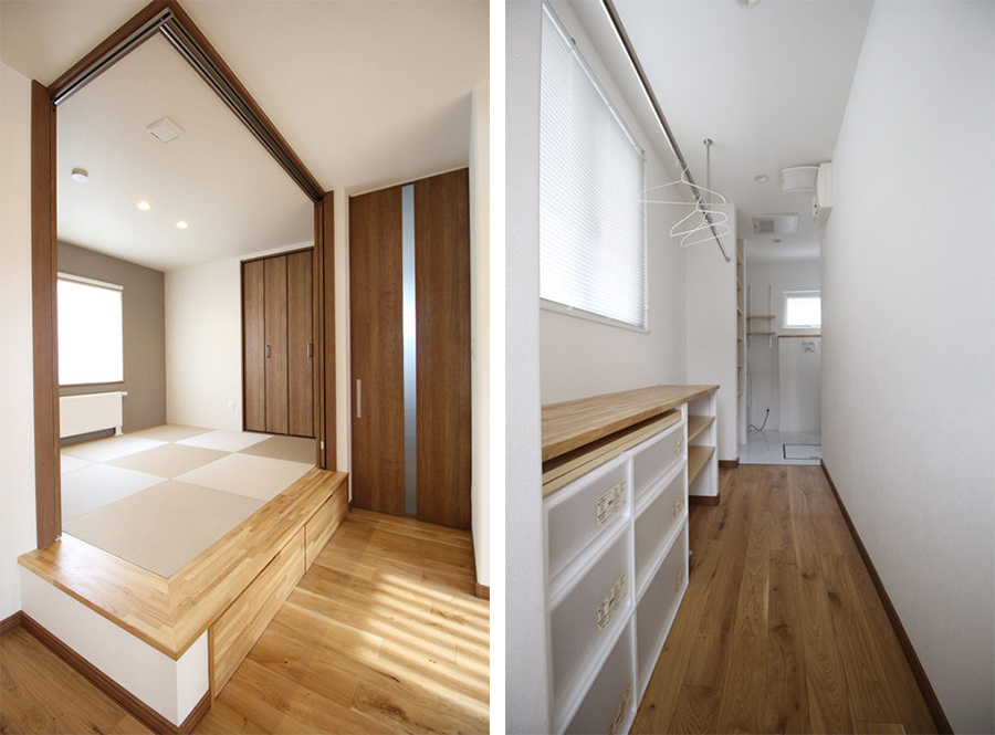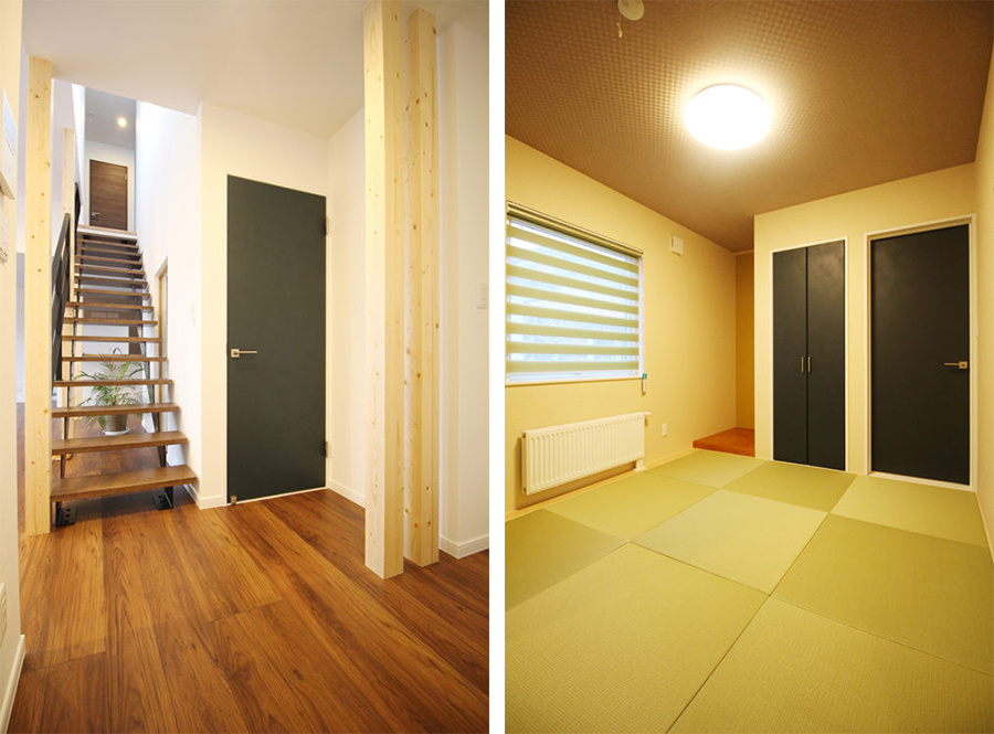 玄関ホールからリビングが直接みえないように、正面に階段を配置。和室は仏壇を置いたり、小さなお子様のお昼寝スペースとしても要望は多いです。