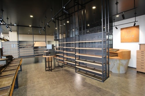 オーナー様と何度も打合せを重ね、什器設計、製作等を行いました。吊り棚や、一枚板のテーブルなど、使用する素材にもこだわっています。少しブルックリン風な雰囲気ですね。
