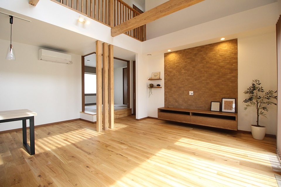 A 床はティーメイスの標準仕様、無垢オークのフローリングです。ブラウンに統一したナチュラルで飽きが来ない内装を目指し、梁や柱も床材の色味に合わせました。