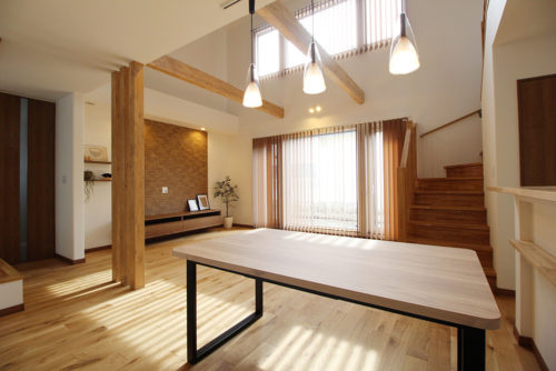 A 太陽の光が気持ちよい空間です。吹き抜けを作るかどうかはお客様の好みですが、これくらい広い吹き抜けだと開放感や2階にいる家族の気配も伝わりやすいです。どのようなプランもメリットデメリット両方あるので、ご説明しながらお客様と一緒に考えていきます。