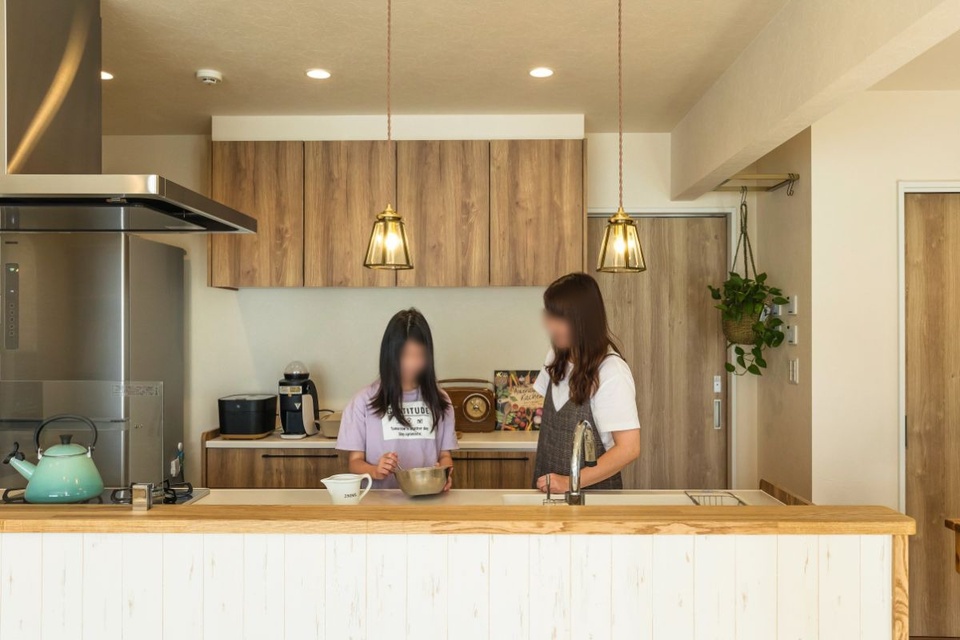 キッチンは二の字型の対面式に。広々として作業しやすく、お菓子作りの好きな娘さんとも一緒に調理することが増えたといいます。家電はリビングから見えない位置に収納棚を作って収めました。
