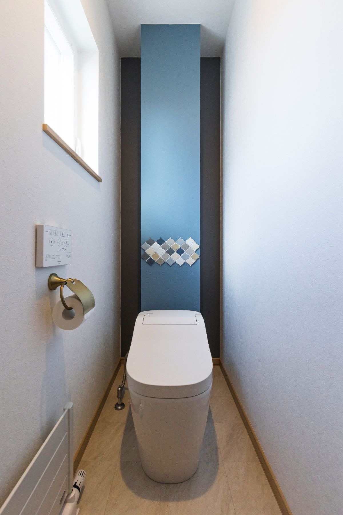 トイレには洗面所とお揃いのモザイクタイルと、それに色味を合わせたクロスをあしらって。「タイルや床の柄はインテリアコーディネーターさんにお任せしました。統一感もありとても気に入っています」(奥様)
