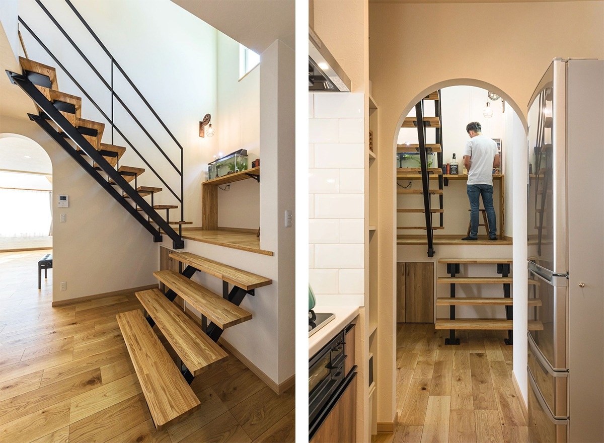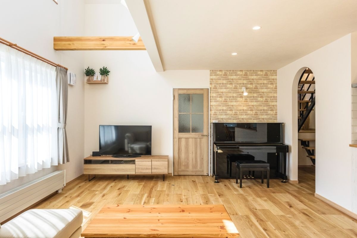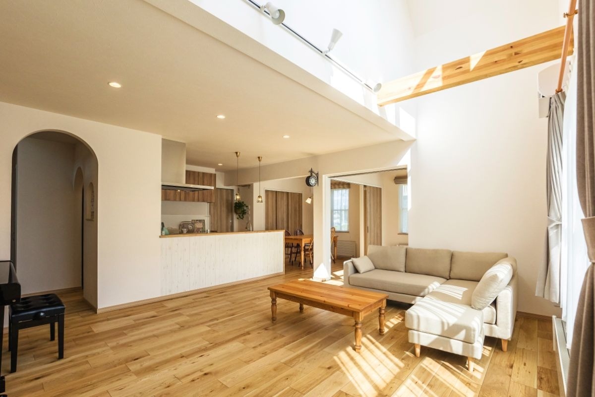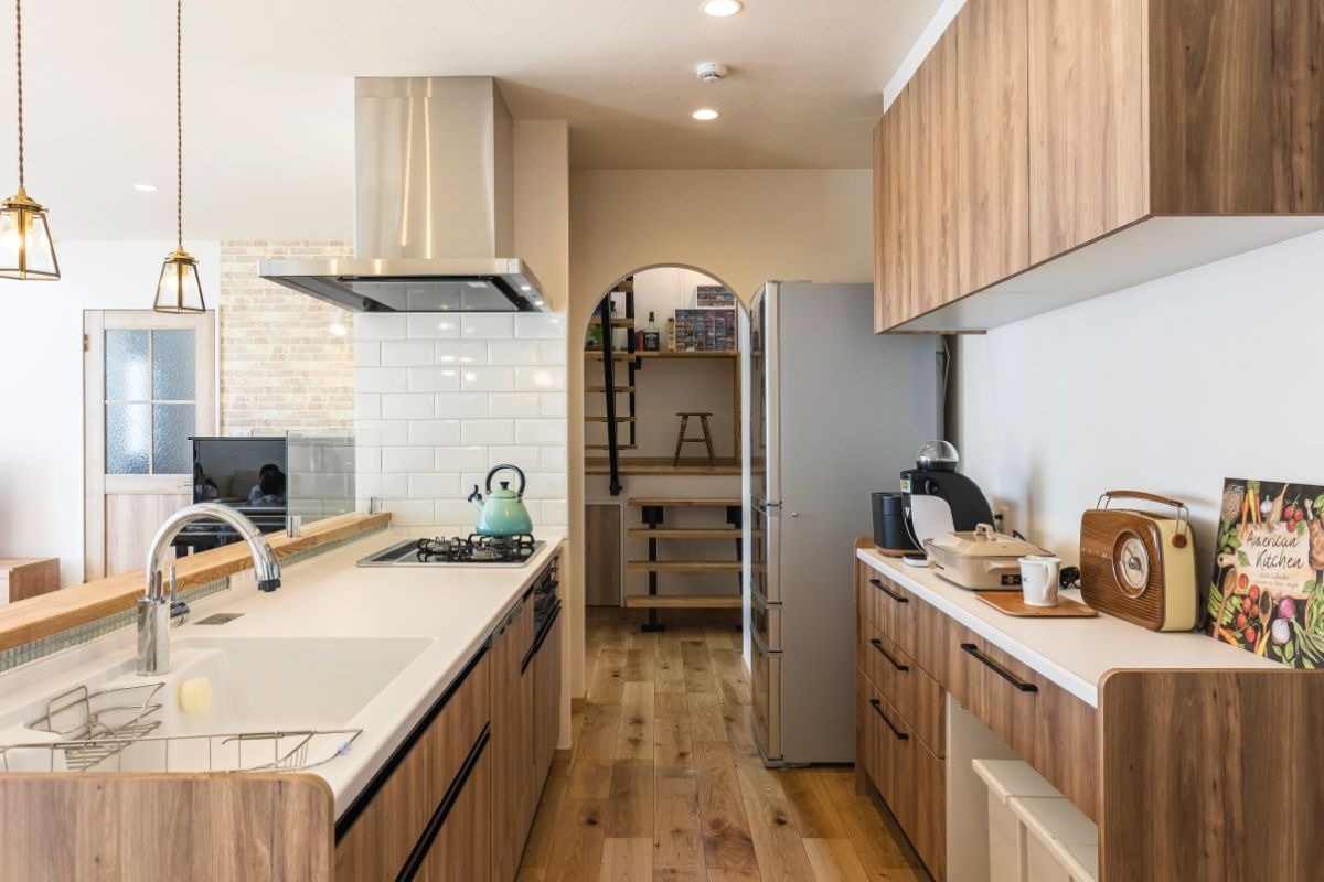「可愛らしすぎないカントリー」を目指したというY邸。木の風合いや色使い、アーチ型の開口などで部屋全体に温かみをもたせつつ、計画的に作った収納ですっきりと家事がしやすい家を実現しました。