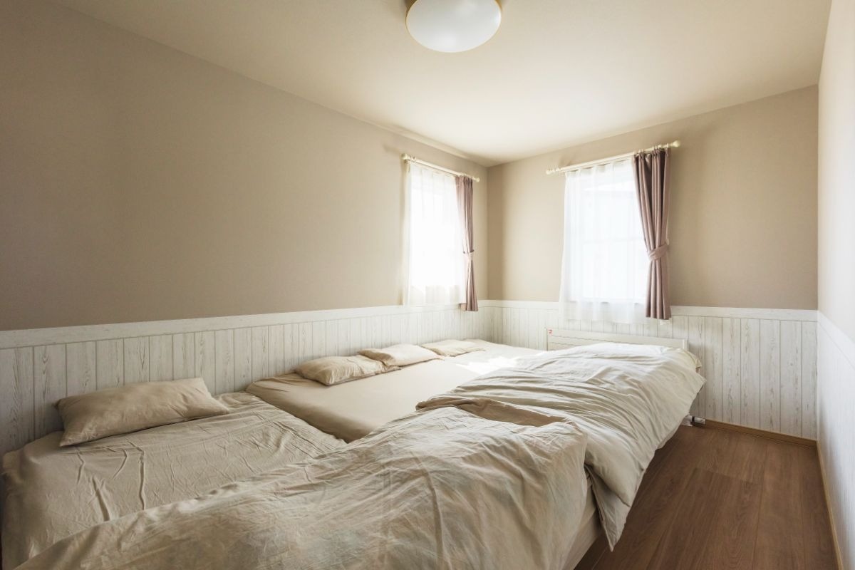寝室は、木の腰壁風のクロスがあたたかみのある雰囲気を作っていました。
