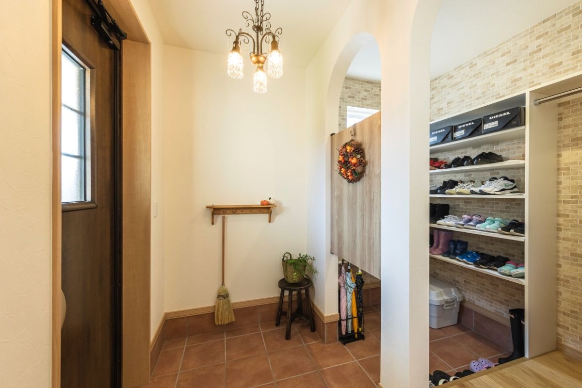 玄関はシューズクロークとコート掛けへの入り口が二連のアーチになっています。