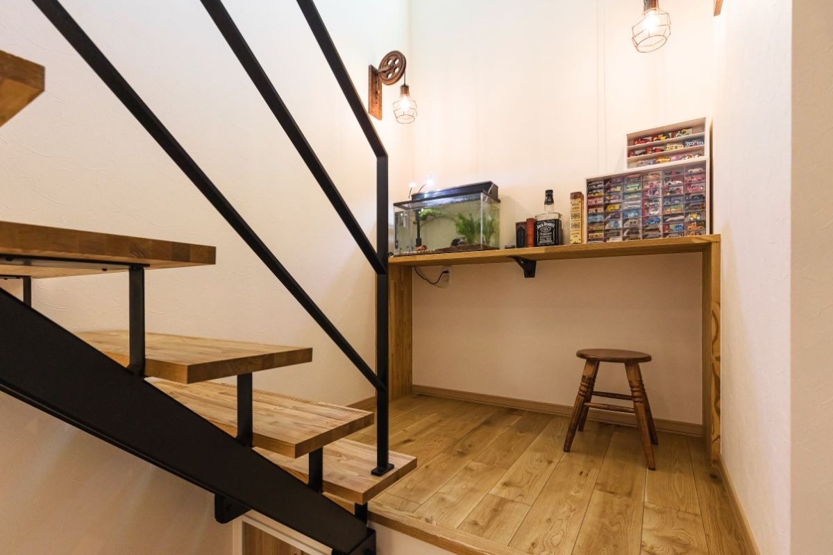 Y邸で印象的だったのがこちらの階段です。踊り場が中二階(スキップフロア)風に使われ、小さな部屋のような空間になっています。