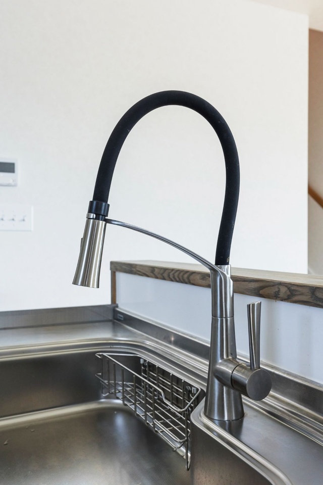 蛇口はドイツ製のスワンネックのものを購入し、施主支給で取り付けてもらいました。「清潔に保ちやすいよう、ホース部分は蛇腹ではなくシリコンのタイプを選びました」(奥様)