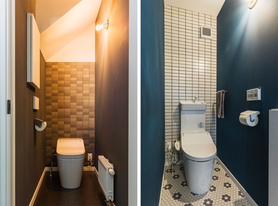 トイレではタイル貼りにも挑戦。youtubeの動画を参考にして貼ったという壁は素人とは思えない仕上がりです。