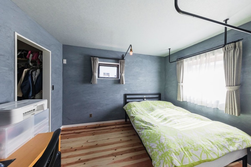 ホームセンターに勤めていた経験のあるというご主人は道具や素材に関する知識も豊富。こちらの寝室の壁は「モルモル」という手で塗れる塗料を使い、家族全員で仕上げました。