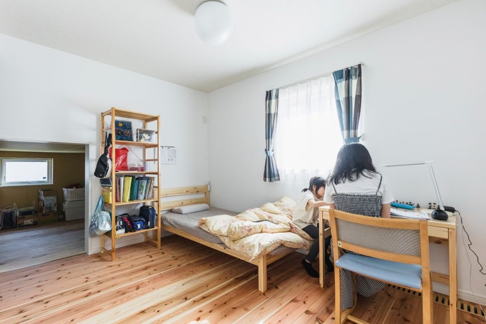 2階のフローリングはすべてSさんの発注した杉材を使用。子ども部屋の壁はローラーで塗りました。