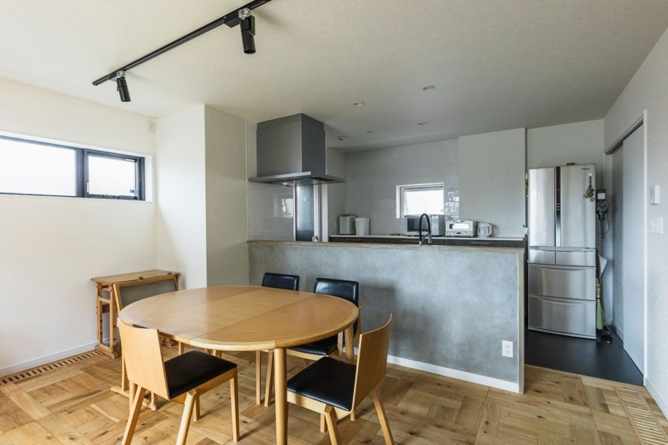 キッチンの立ち上がりには「コンクリートエフェクトペイント」というモルタル風の塗料を使用しています。「インダストリアル風になりすぎずモダンな意匠になるよう、バランスを大切にしました」(ご主人)