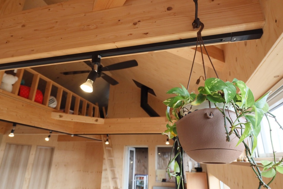 リビングから天井を見上げると、ロフトが目に入ります。当初は吹き抜けの天井となる予定でしたが、大工さんにロフトの作り方を聞きながら、旦那様が自分で梁を足しました。