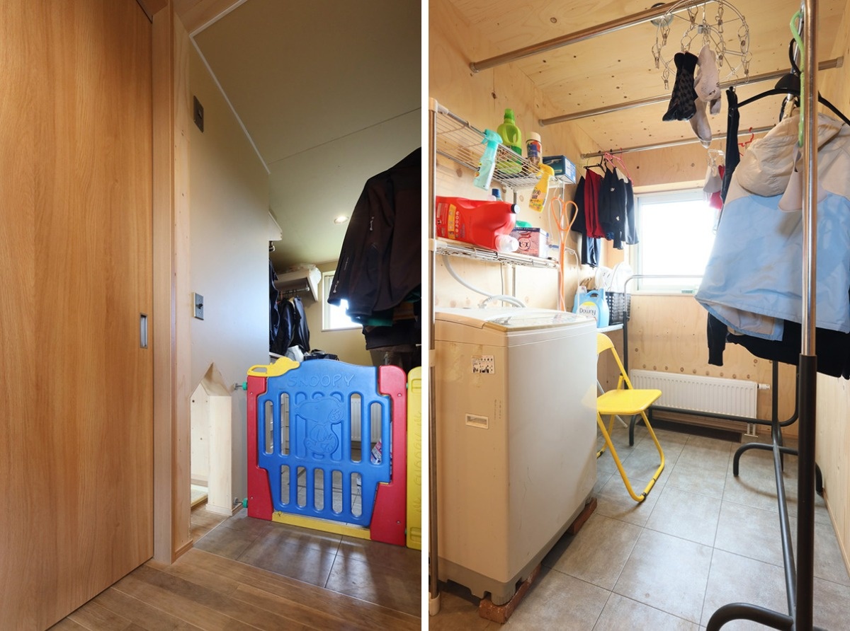 玄関から廊下を真っ直ぐに進むと、広々としたウォークインクローゼットとランドリールームに辿り着きます。ランドリーについて「以前に住んでいた家と比べて、洗濯作業が楽になりました」と語る奥様。洗濯機から衣類を物干し竿にそのまま移動し、乾燥後はその場で畳める手軽さが魅力です。