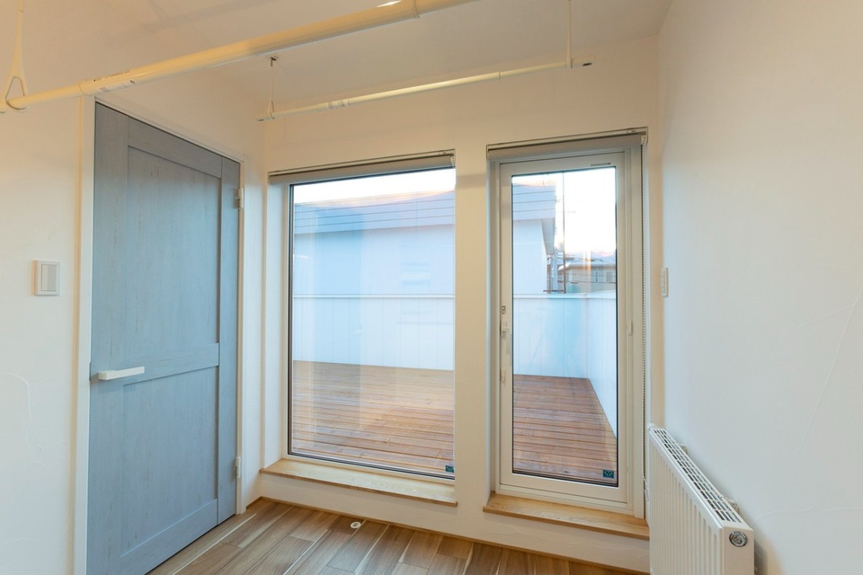 2階ホールの突き当りにはカーポートの上を使ったバルコニーがあります。14畳の広さがあり、床一面に道南杉のウッドデッキが敷き詰められています。