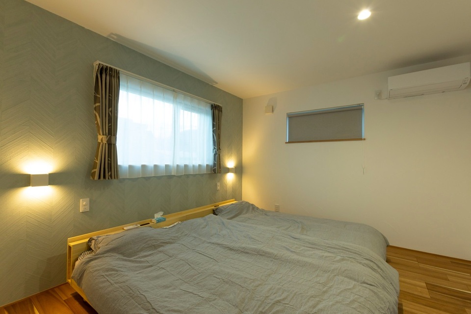 2階には、ヘリンボーン調のブルーグレーのアクセントクロスが目を引く主寝室のほか