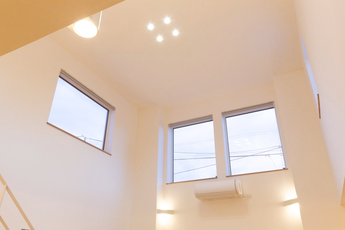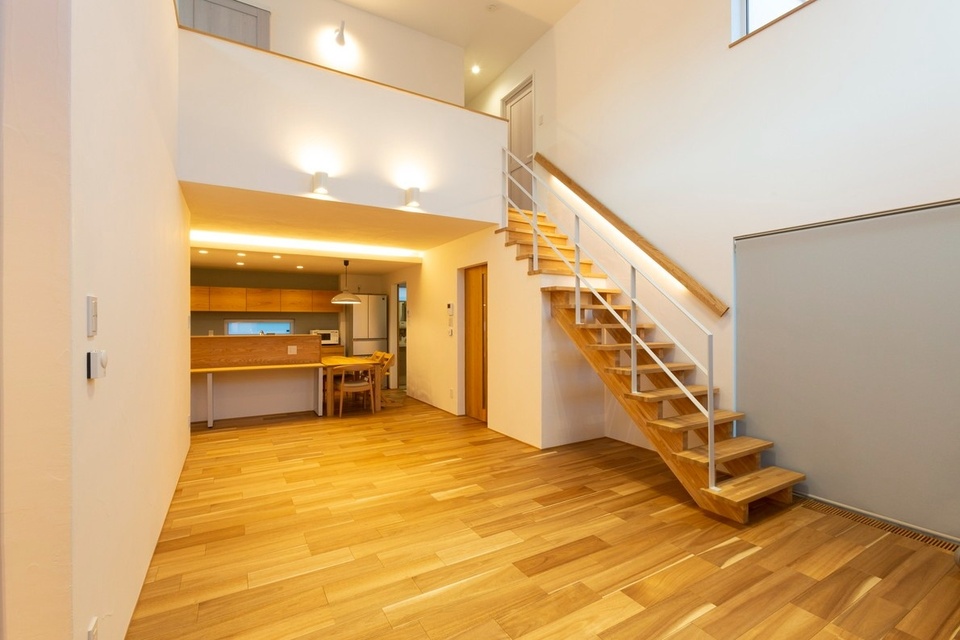 リビングには大きな吹き抜けがあり、高窓から日差しが入る開放的な空間です。床材には天然木を使用した複合フローリング材を採用し、壁は珪藻土の配合された石膏プラスター仕上げ。天然素材の心地よさが室内全体に広がっています。