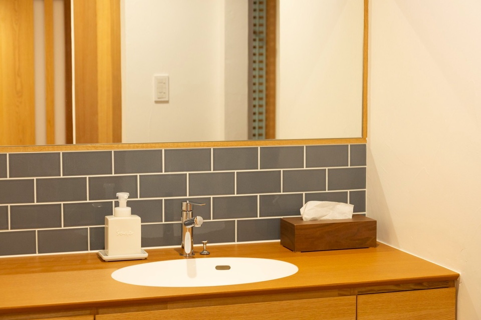 引き出しの付いたキクザワ・オリジナルの洗面化粧台。グレーのサブウェイ・タイルも素敵です。