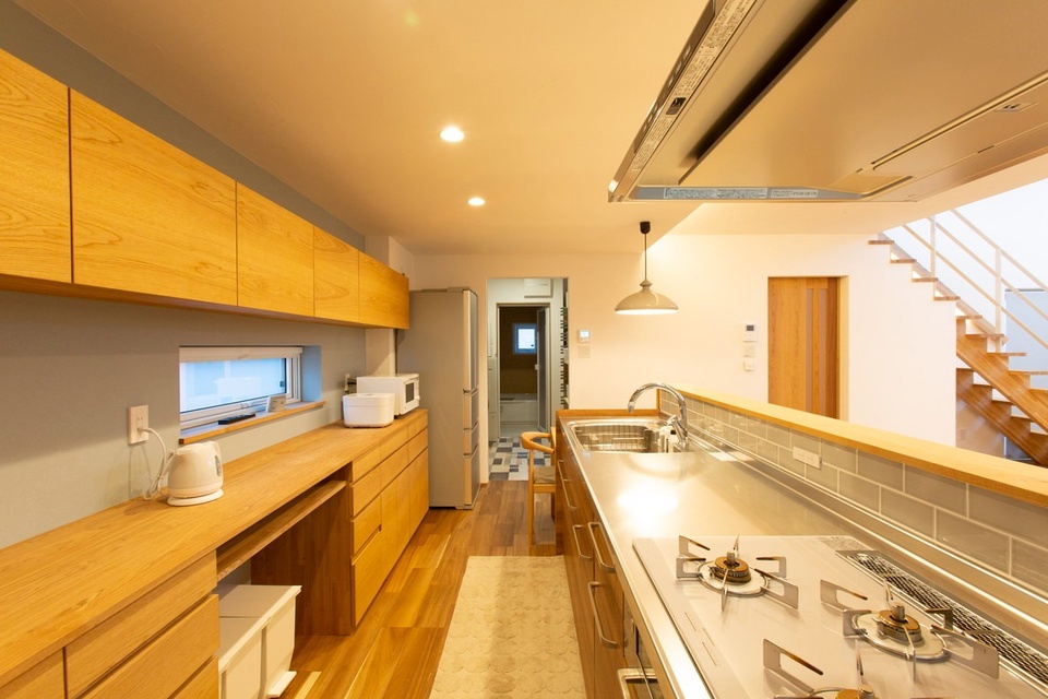 明るい木目とホワイトで統一したキッチン。収納はキクザワの造作によるオリジナルです。