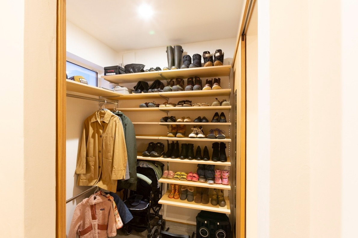 土間続きには引き戸で仕切ることができるシューズ・クローゼットを備えています。靴やコート類、ベビーカーなどお出かけ用品がきれいに収まる広さです。