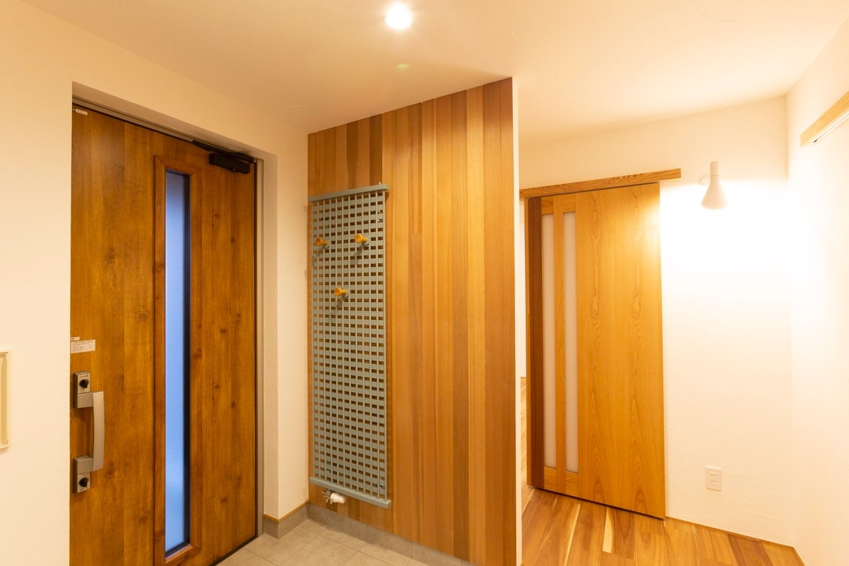 玄関は、レッドシダーの羽目板をアクセントにあしらい、ぬくもりある空間に。