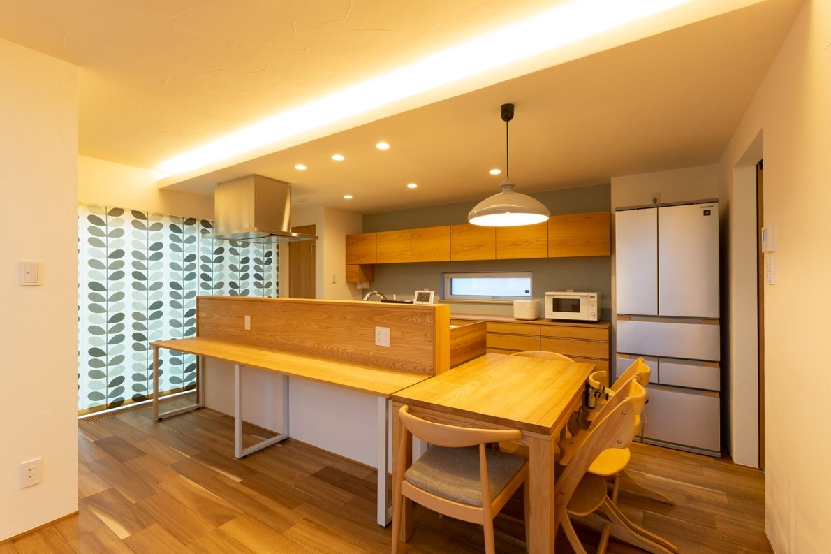 キッチンは正面のカウンターと、4人掛けのダイニングテーブルに囲まれた造りです。カウンターはKさんがお酒を飲むときに座って雰囲気を楽しんでいるそう。今後、おもてなしのスペースとしても大活躍しそうです。