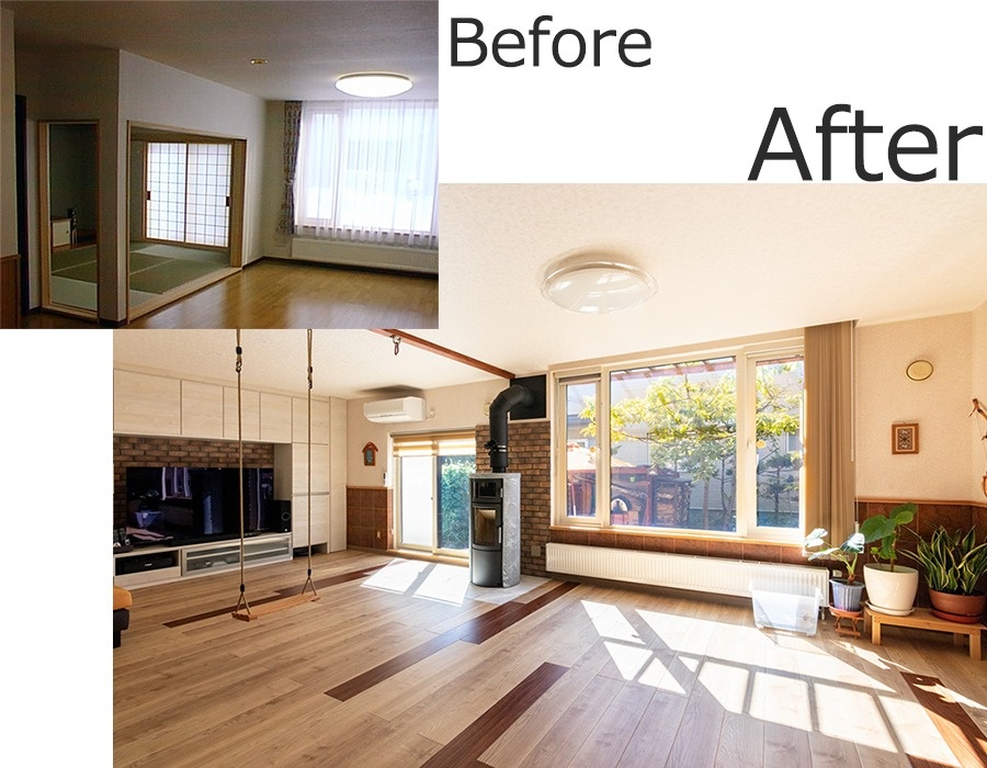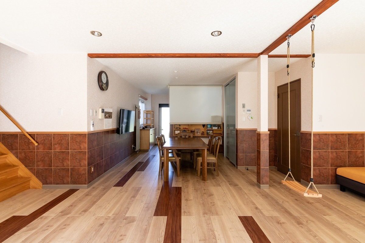 和室を廃し、広々としたリビング・ダイニングにリフォーム。ハンモックを支える梁の強度を高めて、ハンモックとブランコを設置しました。