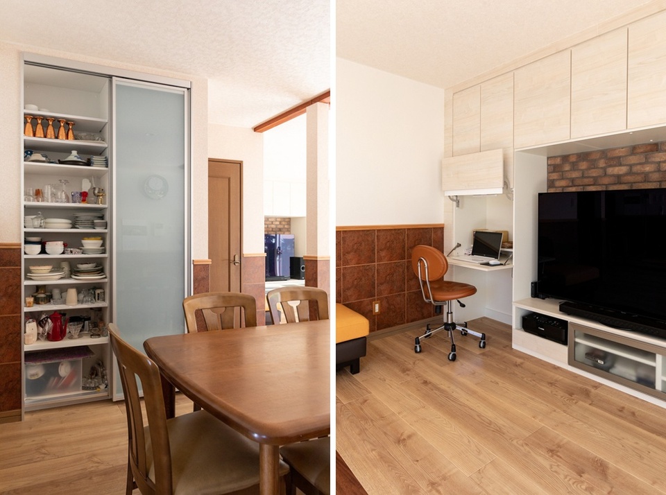 ダイニングに天井までの高さがある食器棚を(左)。和室の押入があった場所にはリビングボードを備えました(右)。