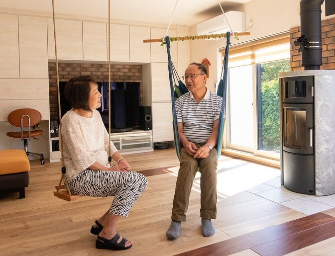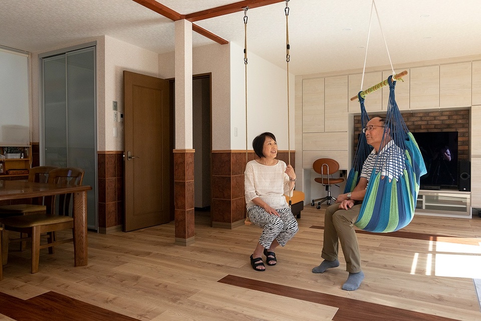 「ソファを置かずに暮らしています。ハンモックは本当に気持ちがいい。ブランコは孫が遊びに来た時、大喜びしています」。