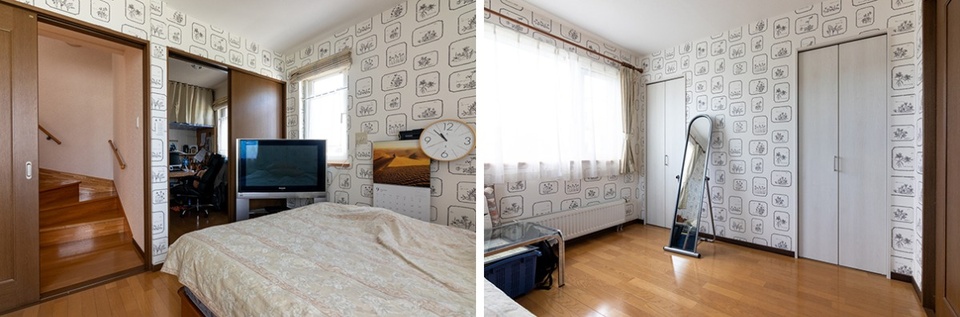 中2階の寝室。箪笥二棹を収納していたスペースを書斎にし(左)、新たに夫婦それぞれのウォークインクローゼットを2つ設けました(右)。