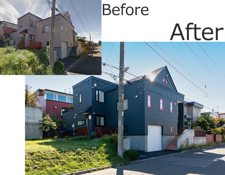 写真は、ビルトインガレージがある外観正面です。外壁はベージュ系のサイディングから深みのあるダークグリーンに塗装、赤いサッシが印象的です。洗練された表情に、モダンな魅力が加わりました。
