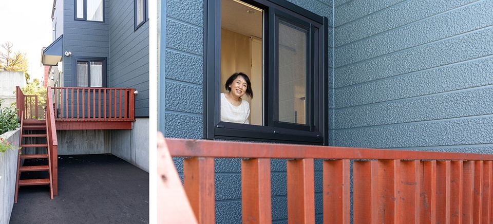 DIYが得意なNさん手作りのウッドデッキ(左)、店舗オープン後は、この窓からお客さまと対面販売を行っています(右)。