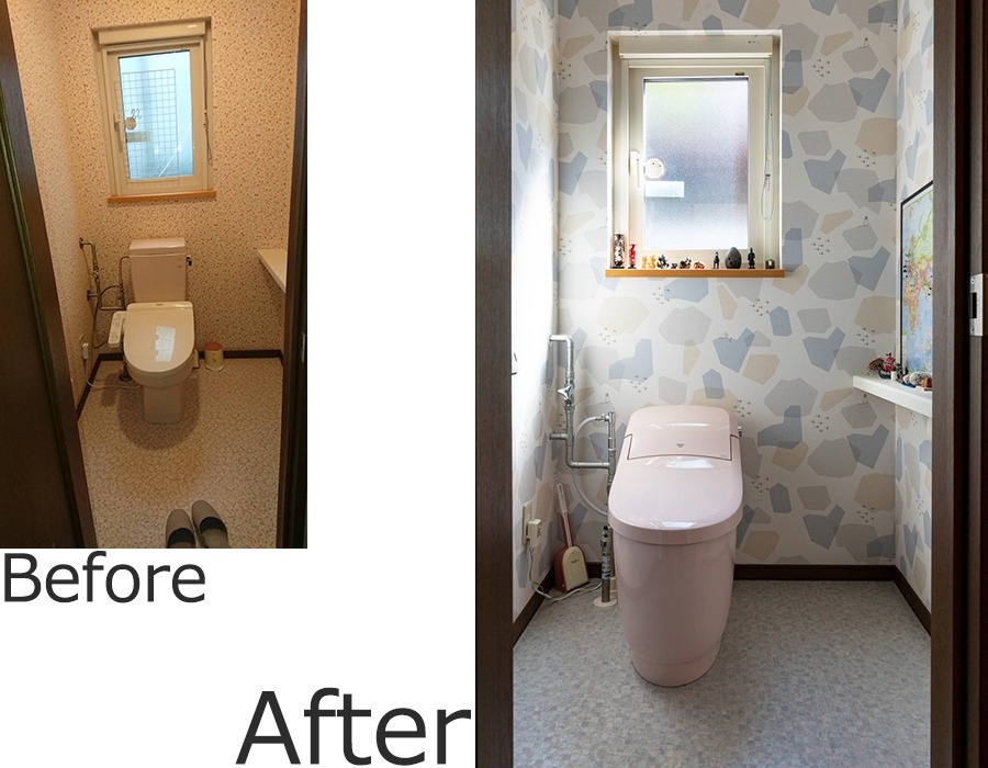 1階のトイレを節水型に。淡い色調のクロスでやさしい雰囲気になりました。