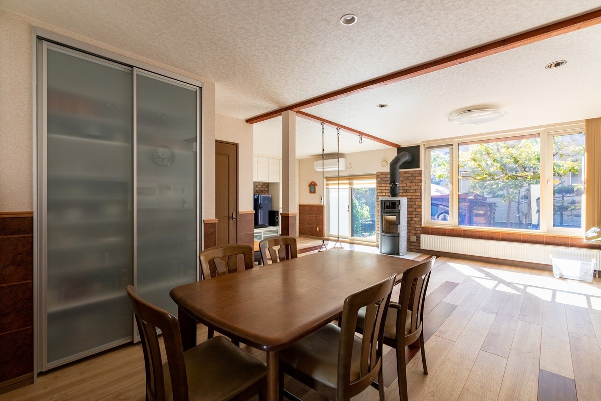 リビング・ダイニングは25畳の圧倒的な広さ。暖房・給湯は灯油からエコジョーズに変更しました。床暖房も採用。さらに、「リビングで過ごす時間を愉しむアイテムとして、薪ストーブも絶対欲しかった」とNさん。薪ストーブはピザを焼いたり、調理も可能です。
