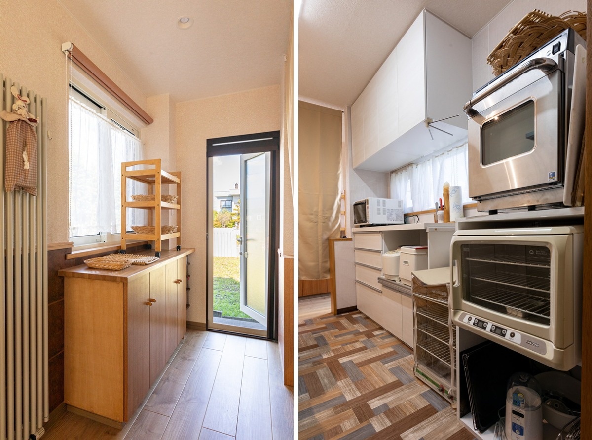 キッチンから、パン作りを行う厨房にリフォームしました。窓に面して配していたキッチンは180度位置を変え、対面式に変更しています。