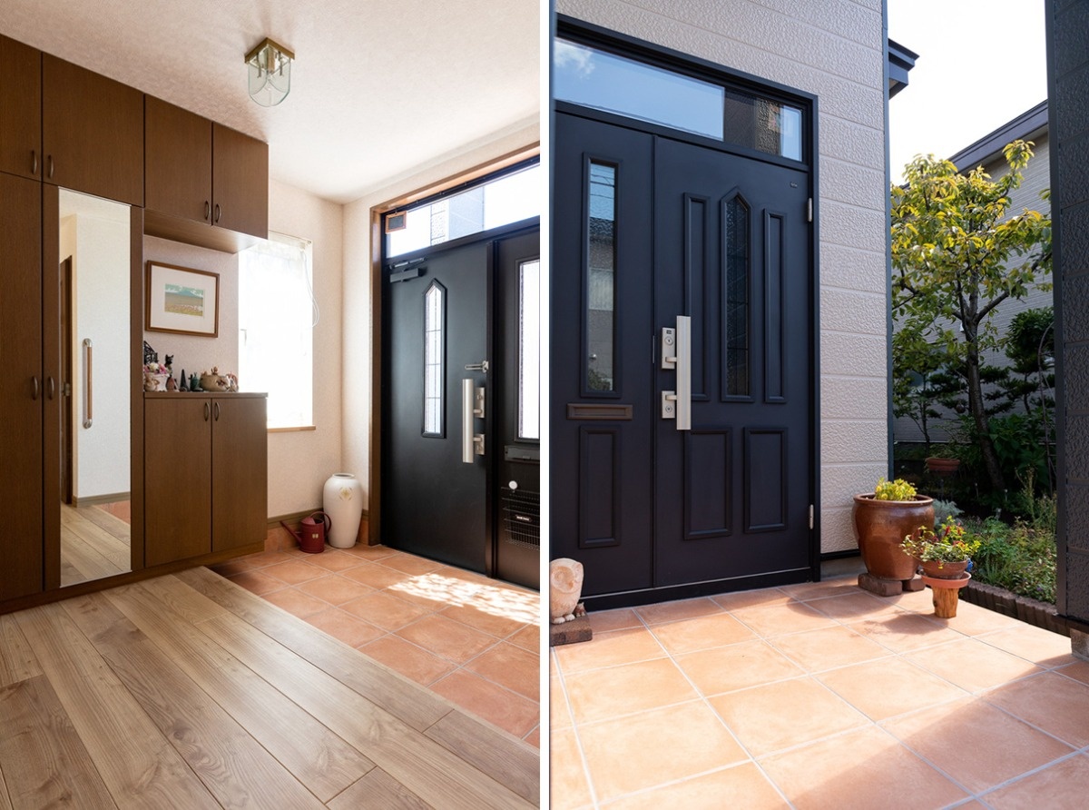 玄関内部(左)と玄関(右)。玄関と外階段のタイルを、テラコッタ調の大判タイルに貼り替えました。