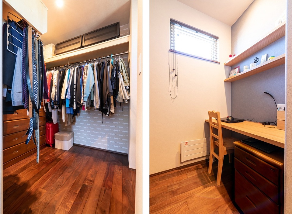 Tさんの希望で、寝室横のWICの一部に、隠れ部屋のようなワークスペースを備えました。仕事に集中したいときや、オンラインのミーティングで活躍中です。