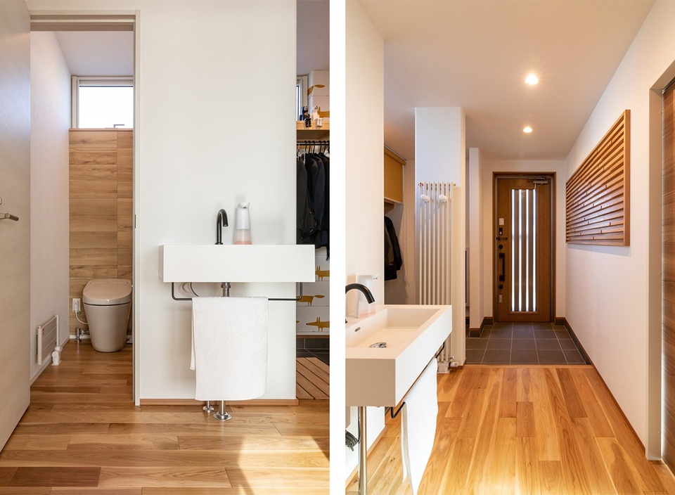 玄関にクローゼットと手洗いを付けて、外と内を分ける境界に