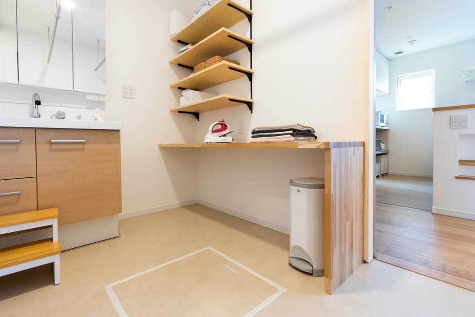 洗面化粧台横のカウンターは洗濯物を畳んだり、アイロンがけをしたり、家事の時短に大活躍。将来、娘さんの身支度スペースとしても活用する予定です。