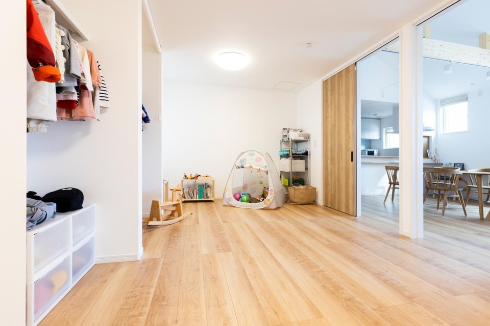 「はい、どうぞ!」取材中、子ども部屋で遊んでいた息子さんがおもちゃの果物をリビングに運んできて、もてなしてくれました。リビングとの行き来がしやすく、親子がいつも互いの存在を感じていられる安心感があります。