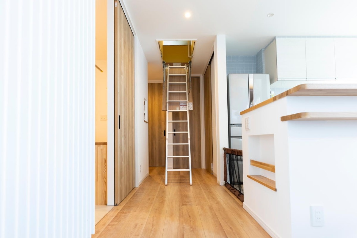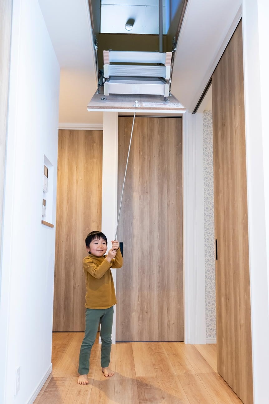 上ると、屋根裏を利用した約9畳ある大容量のロフト収納です。季節外の布団や冠婚葬祭の衣類など、普段使わないものを保管しています。