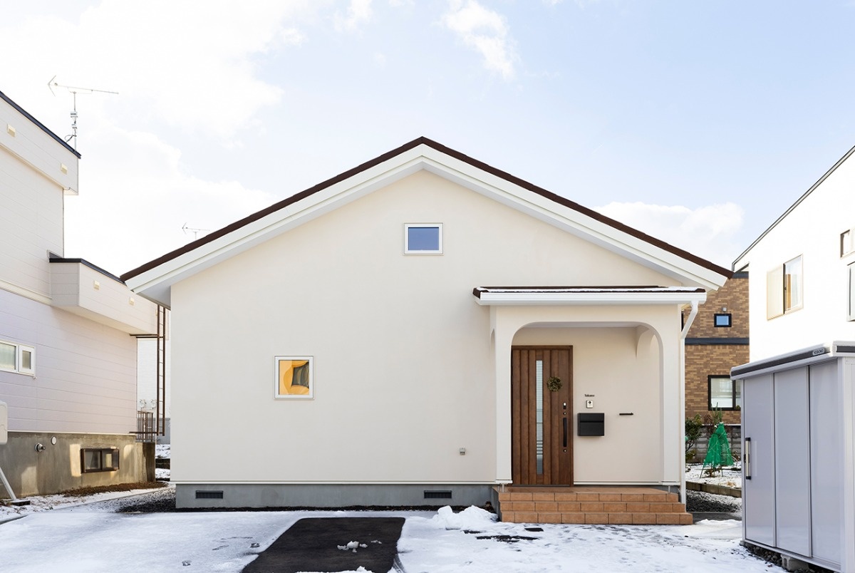 閑静な住宅地に建つT邸は、三角屋根で塗り壁の白が映える、かわいい平屋建て。共働きのご夫婦、保育園に通う息子さんと娘さんの4人暮らしです。