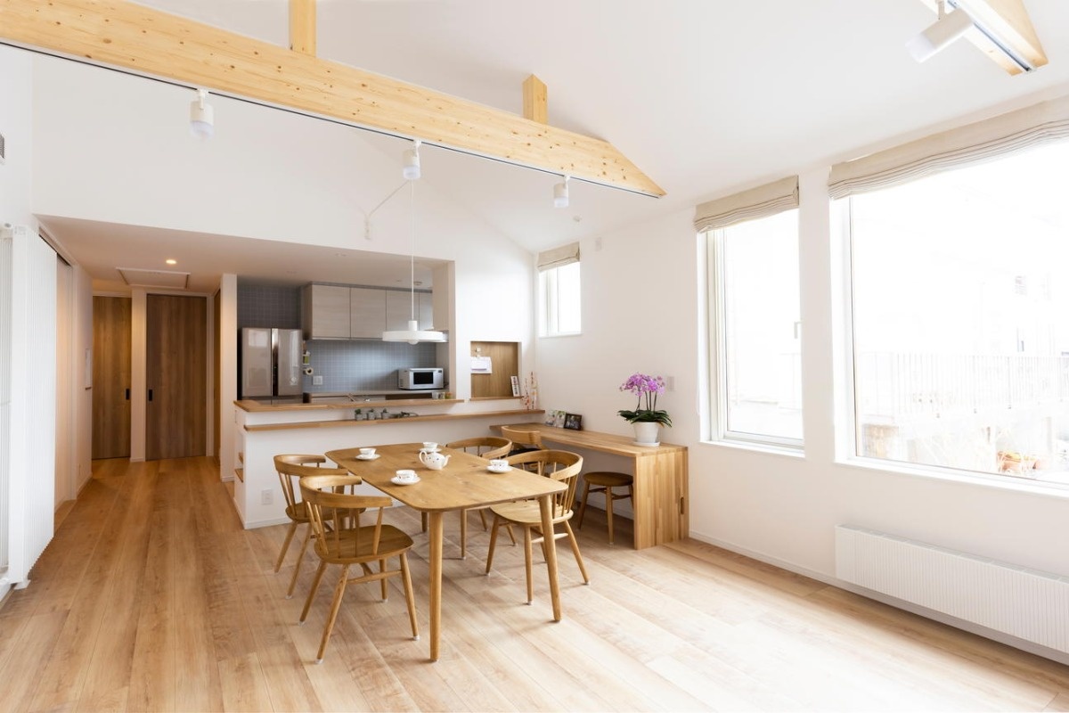 三角屋根に沿って設けられた勾配天井のリビング・ダイニング。梁を現しにすることで天井が高くなり開放感を感じられます。壁際の造作デスクは、お子さん二人が並んで座れるサイズ。スタディ・スペースとして活用できます。