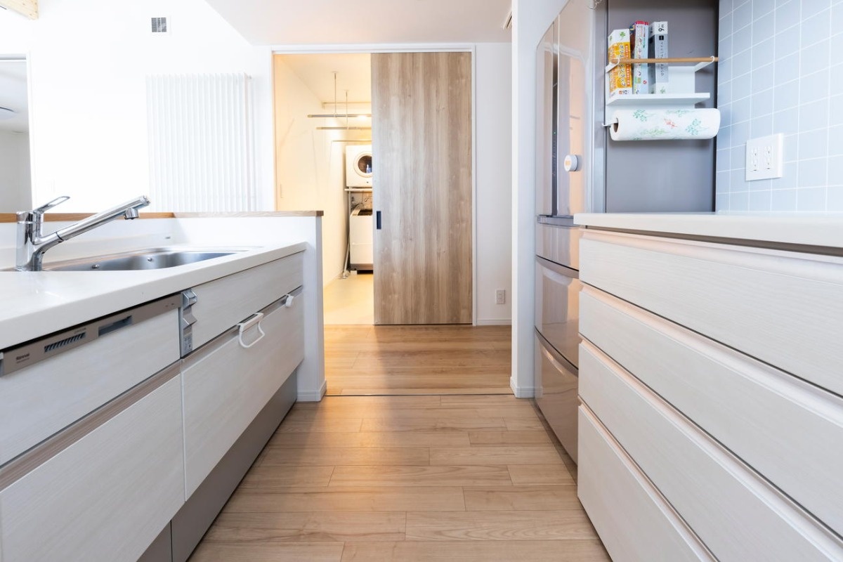 キッチンにある食器や調理器具などは引き出しと棚にすべて収納。調理がはかどります。食洗機は水道代の節約に一役買っています。