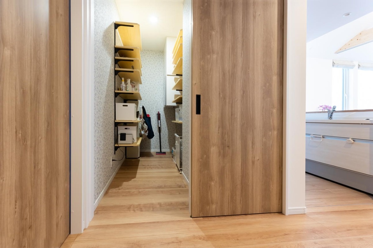 キッチン後ろのパントリーには食料品や日用品などを収納。高効率ガス給湯器「エコジョーズ」と熱交換換気システムも同じスペースにまとまっています。