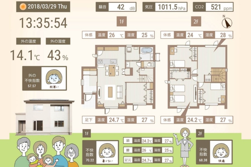 室内に居るときの足元と頭の位置での温度の違いや、騒音、湿度などを数値で「見える化」することで、より快適な住環境を作り出すためのヒントにもしていきたいのです。(現在は共同研究終了につき、公開しておりません)