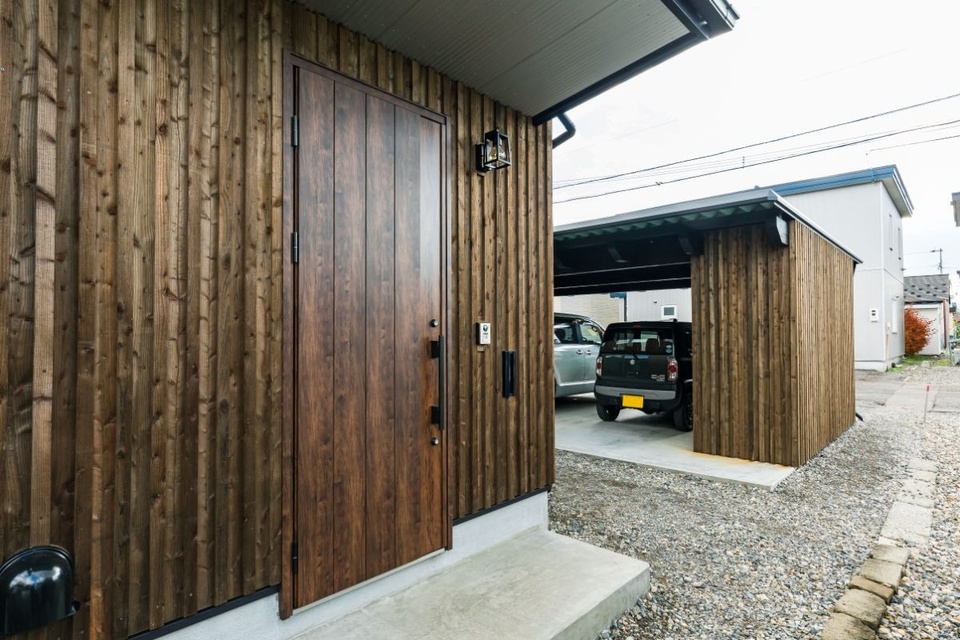 カラマツ外壁が主役のシンプルな外観。住宅と並んで存在感を放っているのは、同時に作った物置兼カーポートです。