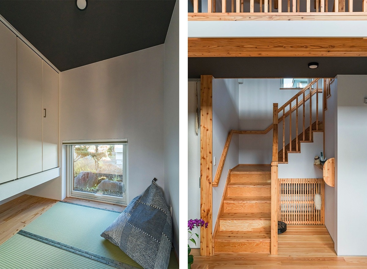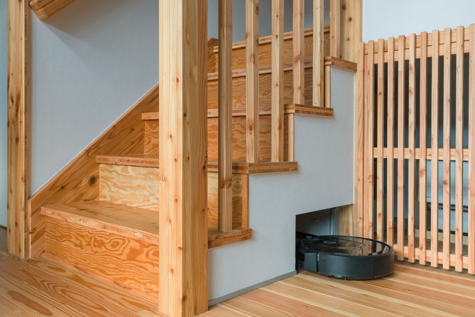 写真右)階段下の空間にはエアコンとロボット掃除機の充電スポットを設置しました。
