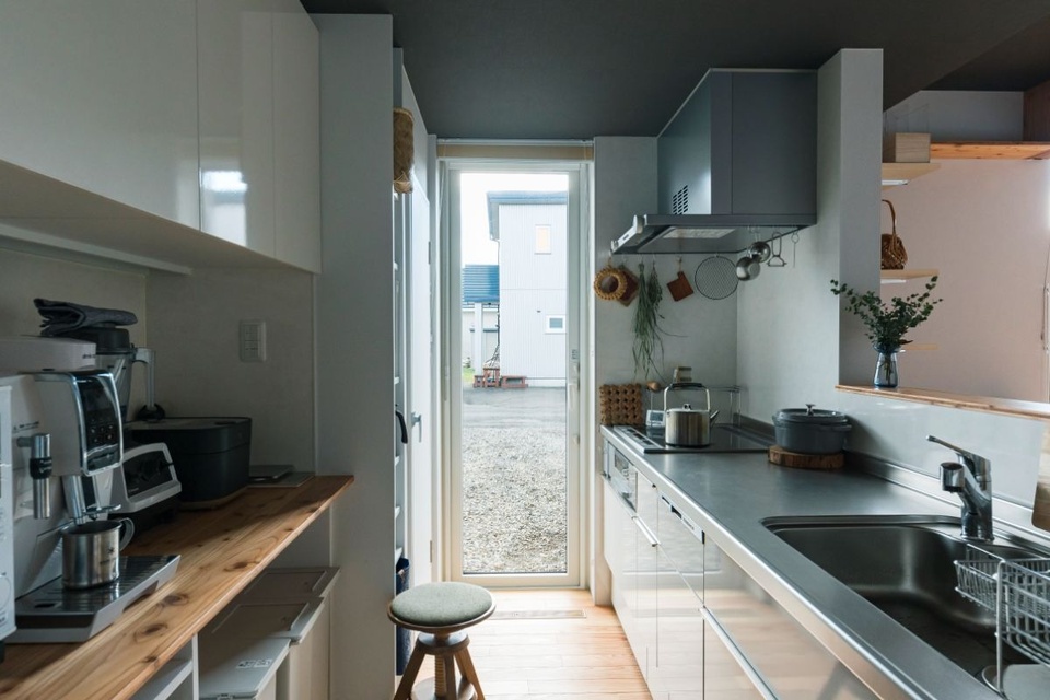 家庭菜園へのアクセスを考え、キッチンには庭に続く勝手口を設けました。