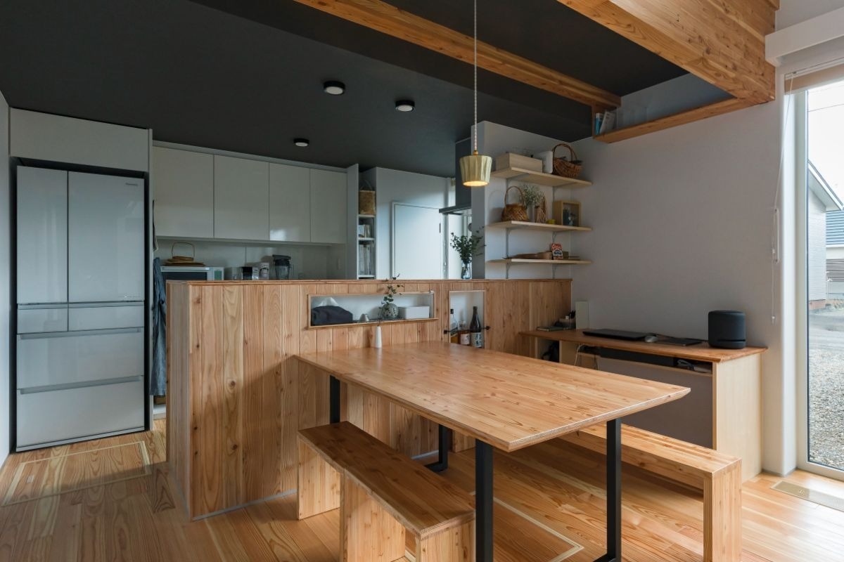 LDKは梁と床だけでなく、キッチンの壁やダイニングセットまで道産のカラマツ材で造作し統一感を出しました。