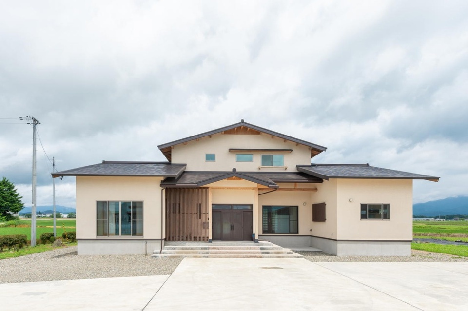 2019年夏に完成したS邸は、家の中心に玄関を構え、堂々とした佇まいの日本家屋です。「風通しと日当たりが良い昔ながらの家にしたかった」とSさん。奥さまも「流行に左右されないから」と、夫婦ともに和風を希望する中、地元密着の村上工務店に依頼しました。